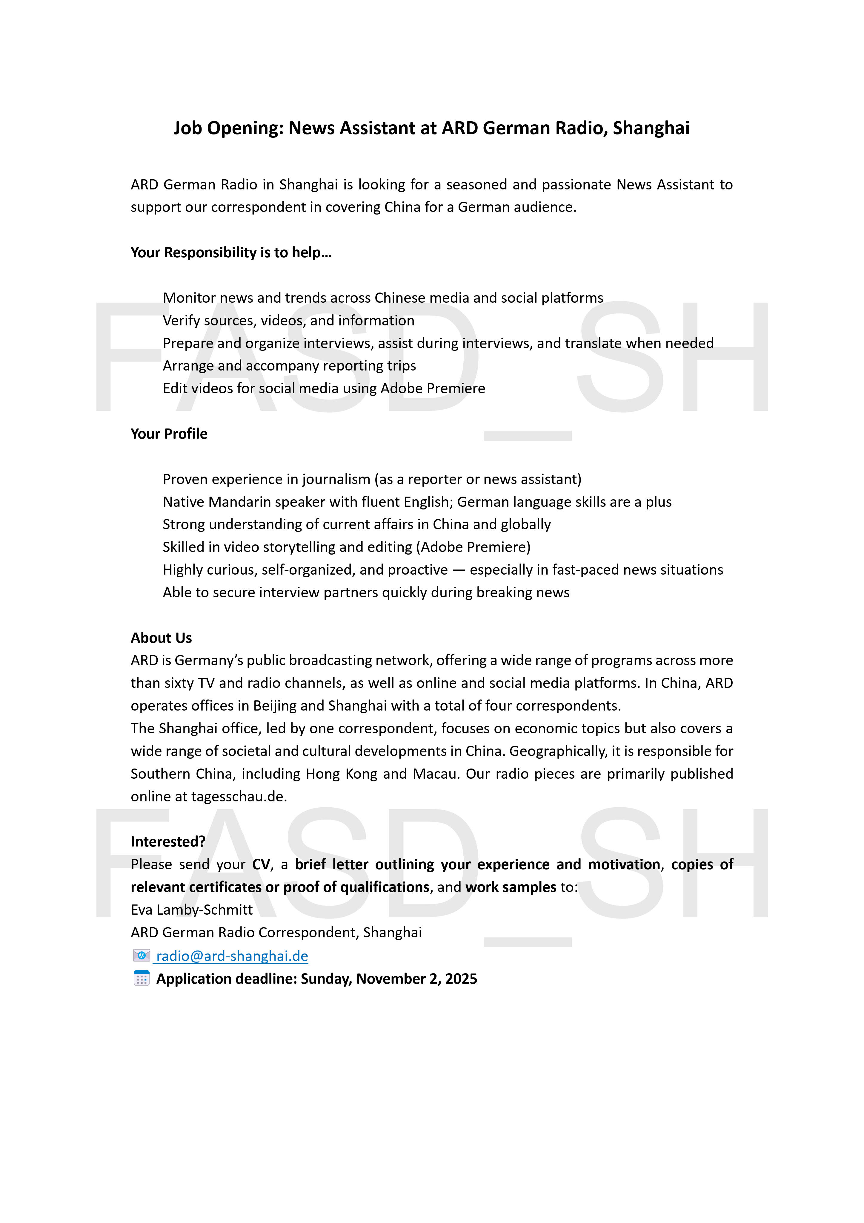 【招聘中国籍雇员】德国广播协会上海记者站新闻助理