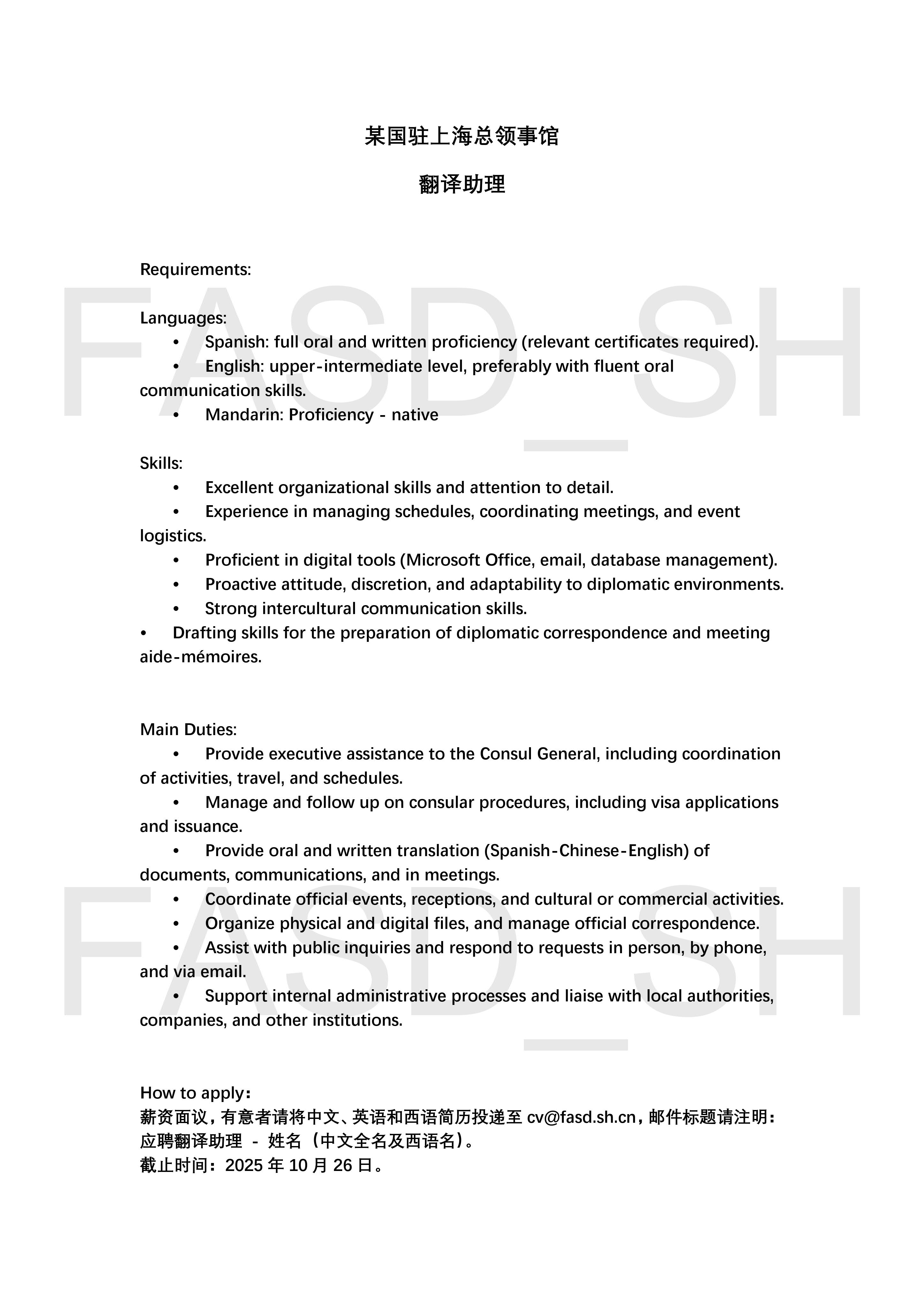 【招聘中国籍雇员】某国驻上海总领事馆 翻译助理