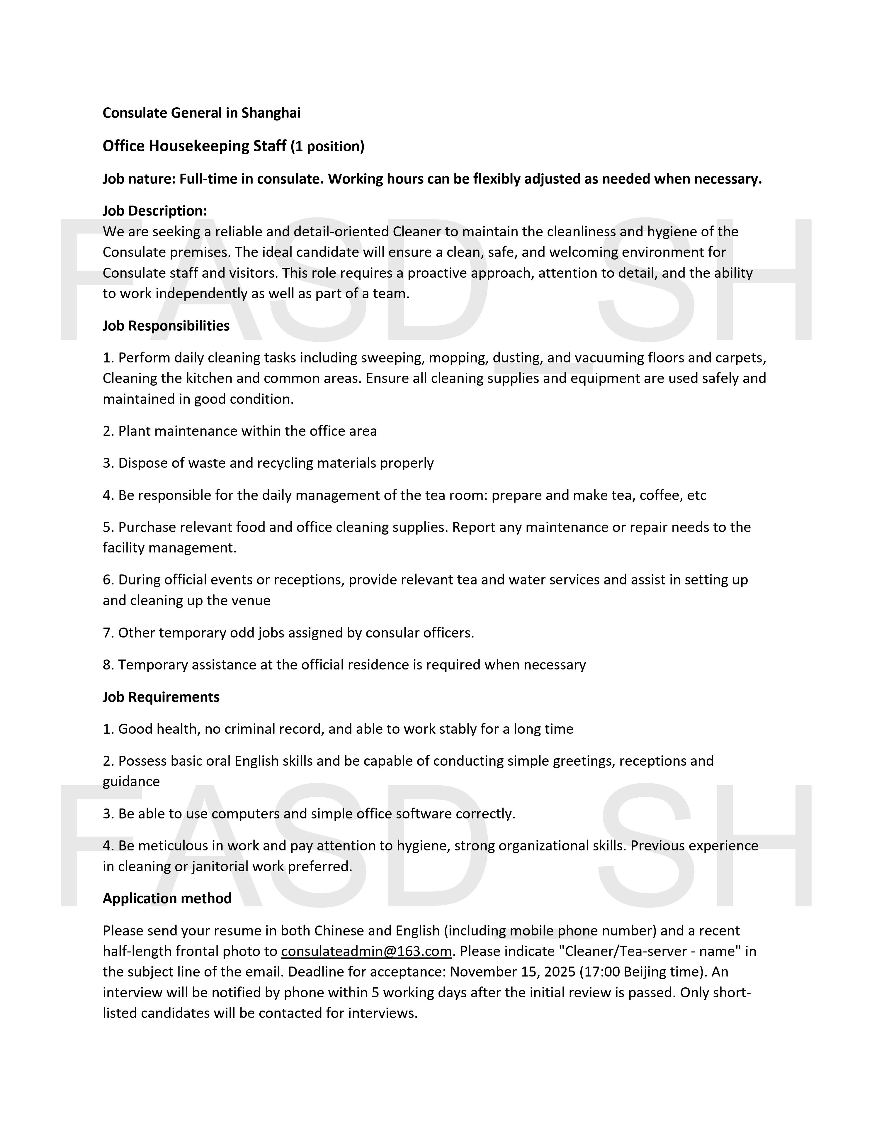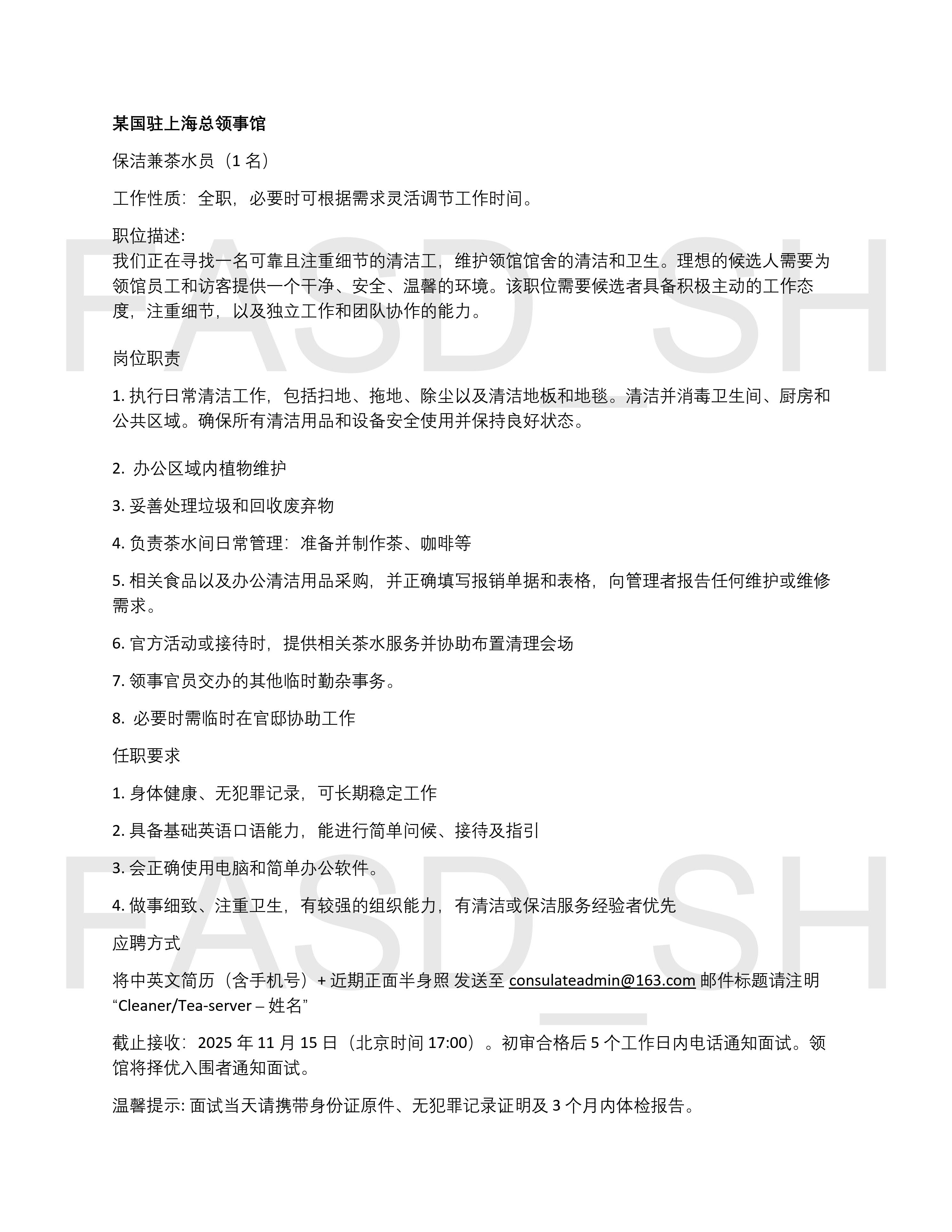 【招聘中国籍雇员】某国驻上海总领事馆保洁兼茶水员