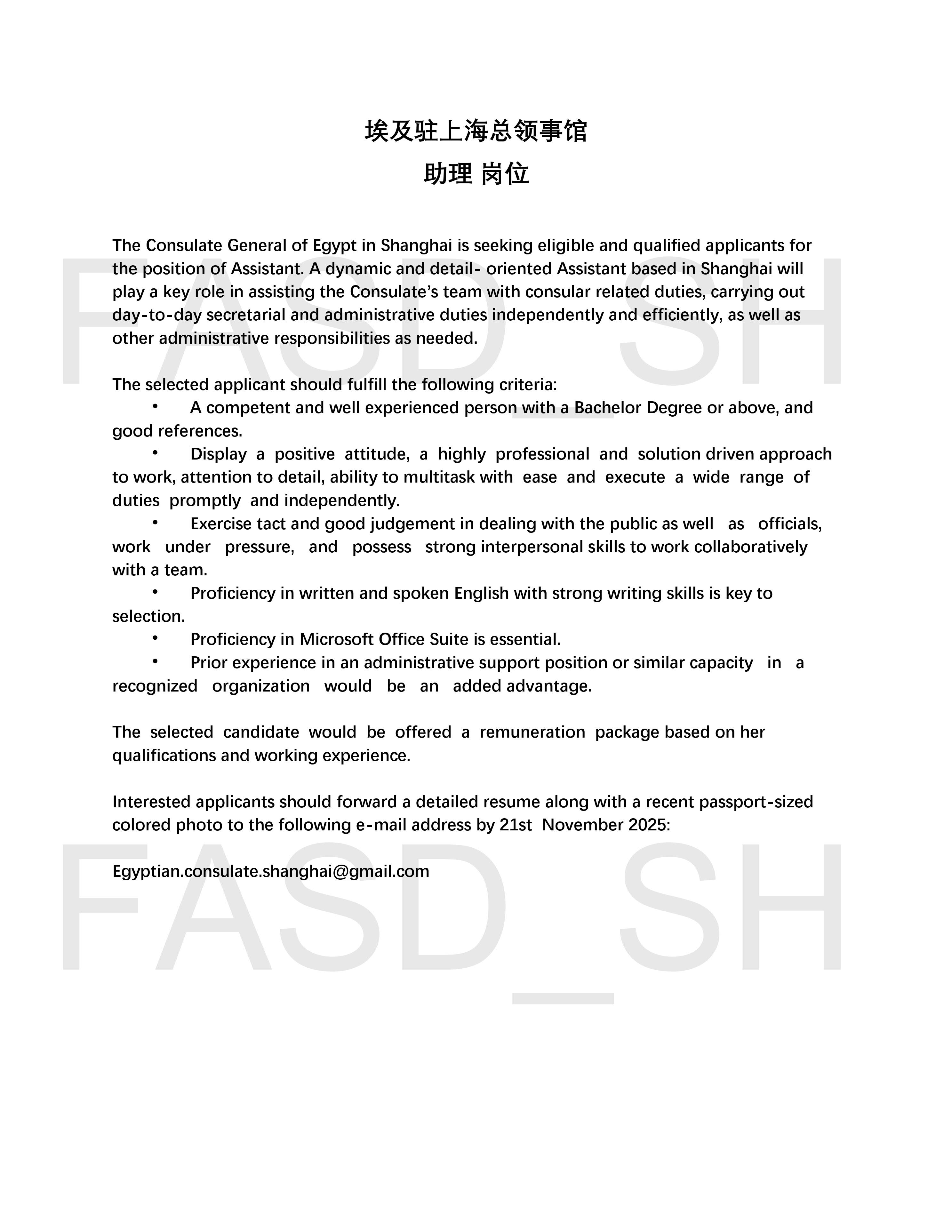 【招聘中国籍雇员】埃及驻上海总领事馆助理