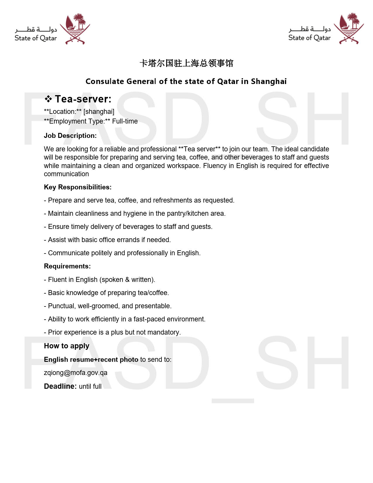 【招聘中国籍雇员】卡塔尔国驻上海总领事馆茶水员