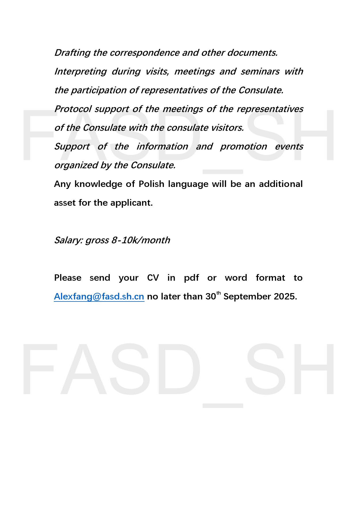 【招聘中国籍雇员】波兰驻上海总领事馆签证助理/口译