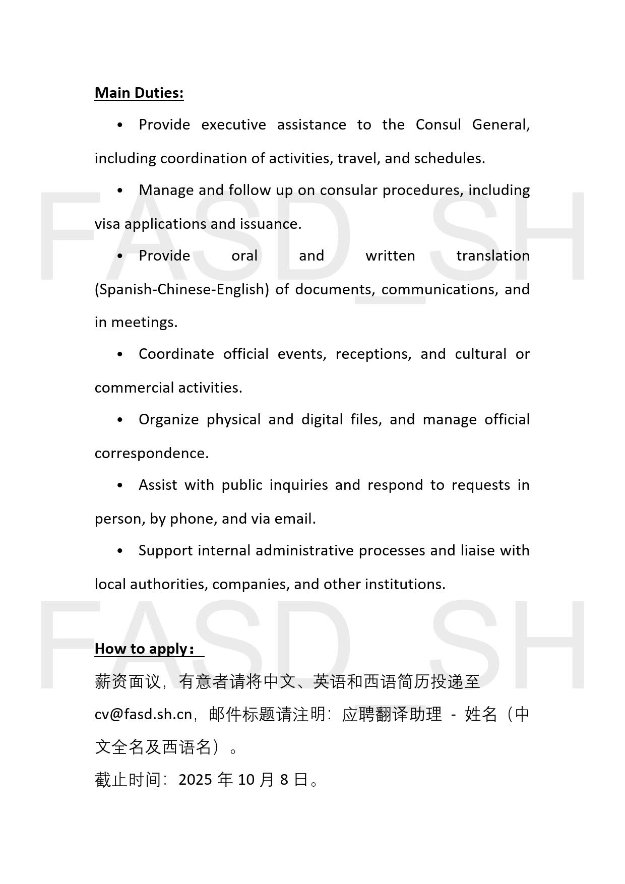 【招聘中国籍雇员】某国驻上海总领事馆 翻译助理