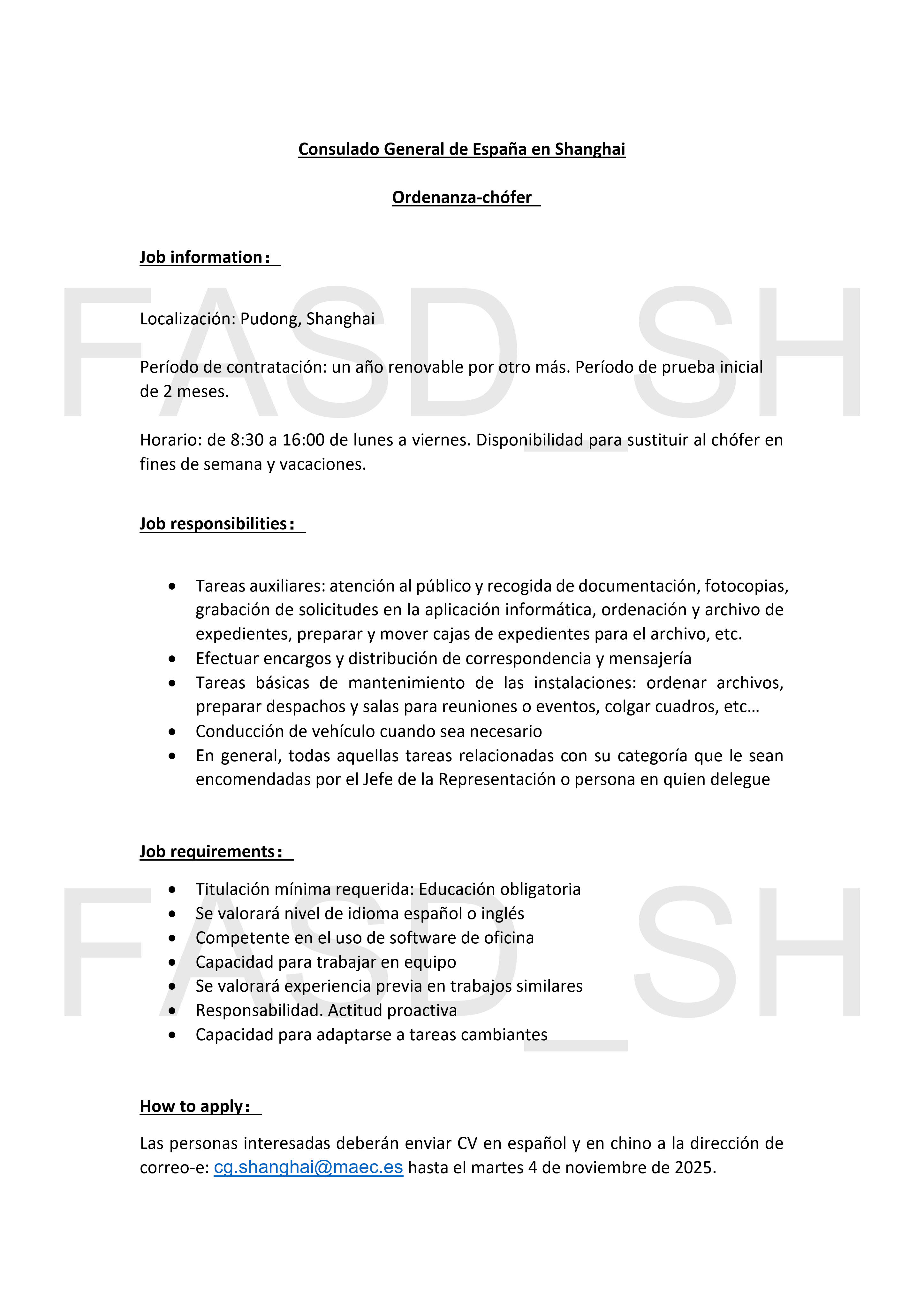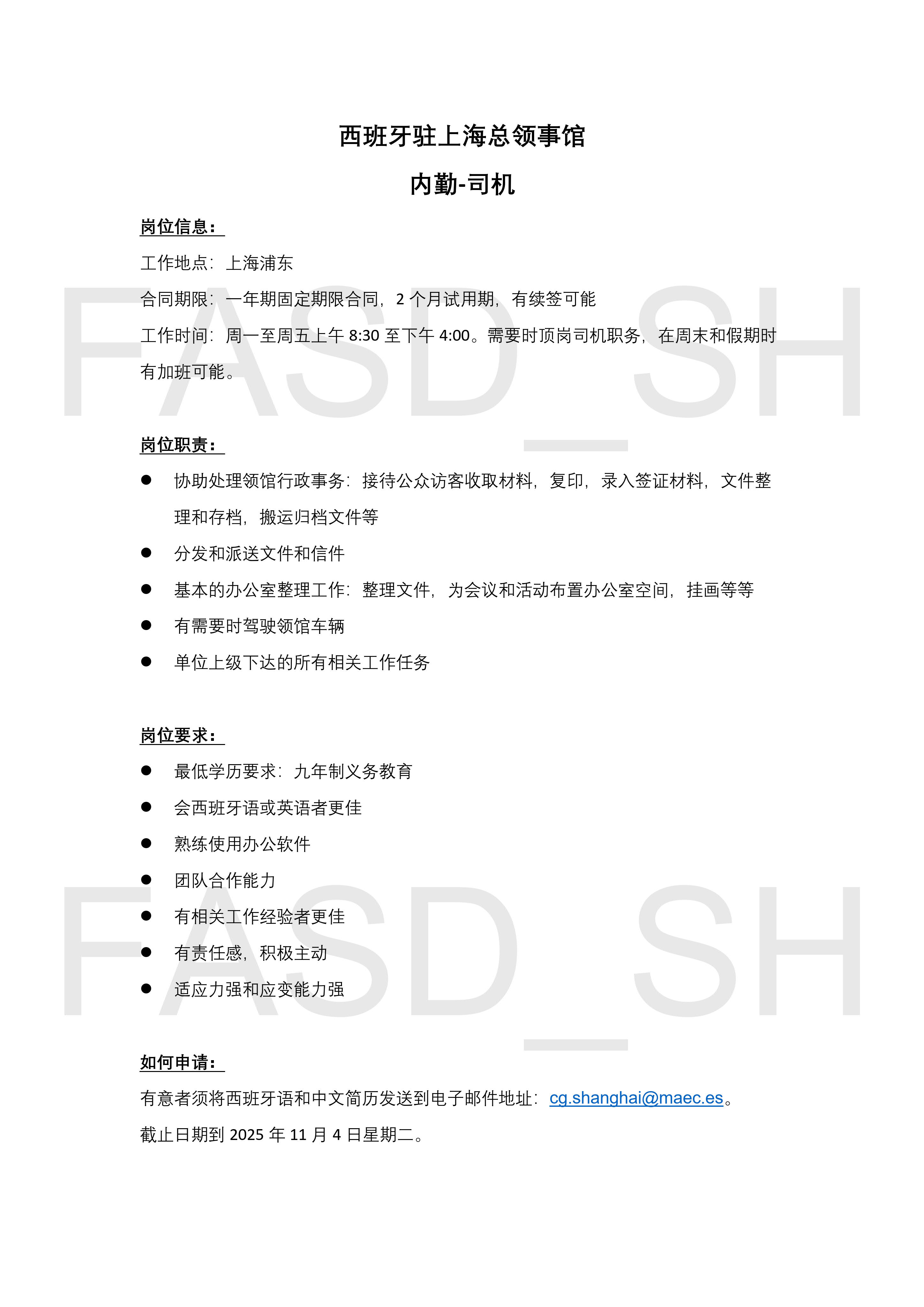 【招聘中国籍雇员】西班牙驻上海总领事馆 内勤-司机