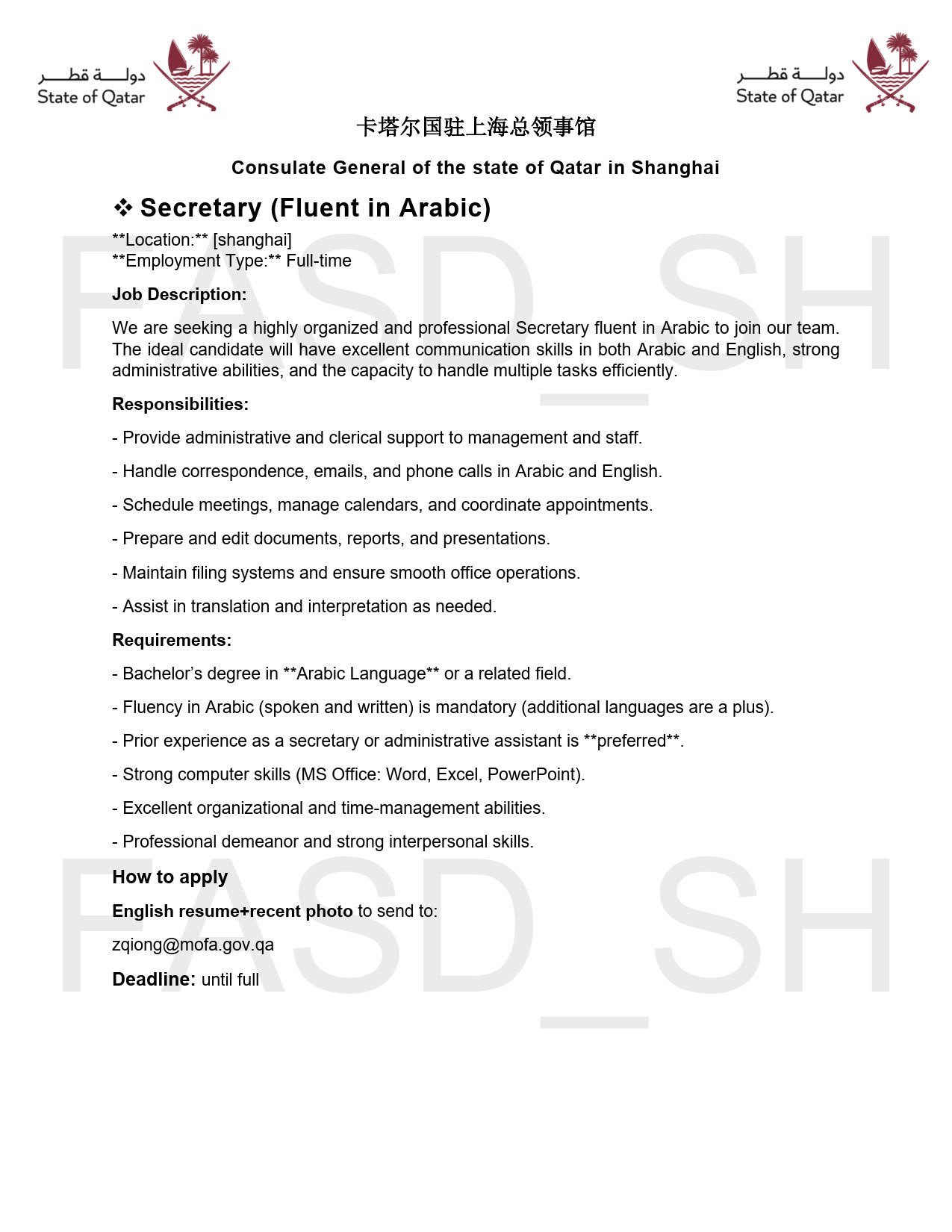 【招聘中国籍雇员】卡塔尔国驻上海总领事馆秘书