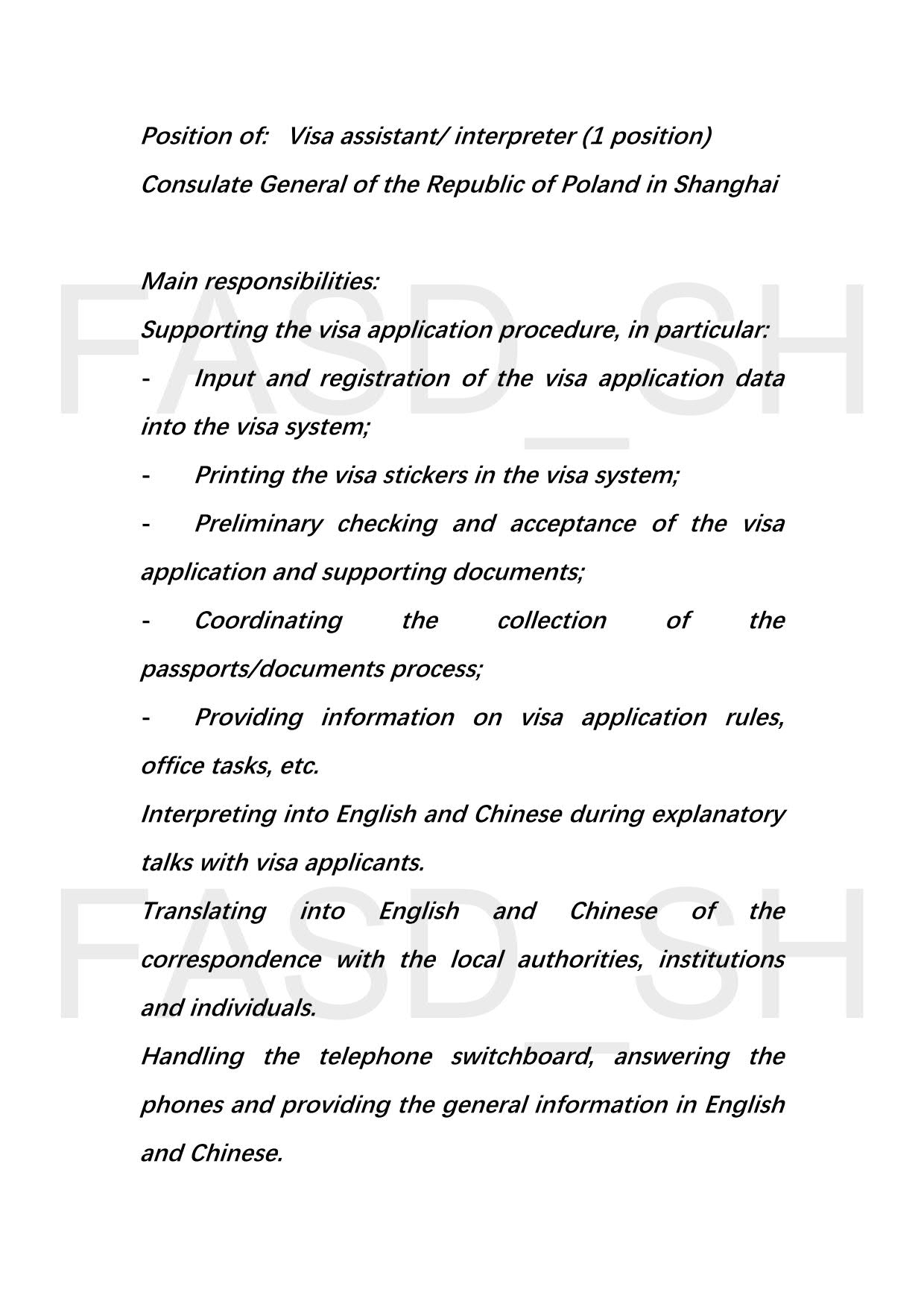 【招聘中国籍雇员】波兰驻上海总领事馆签证助理/口译