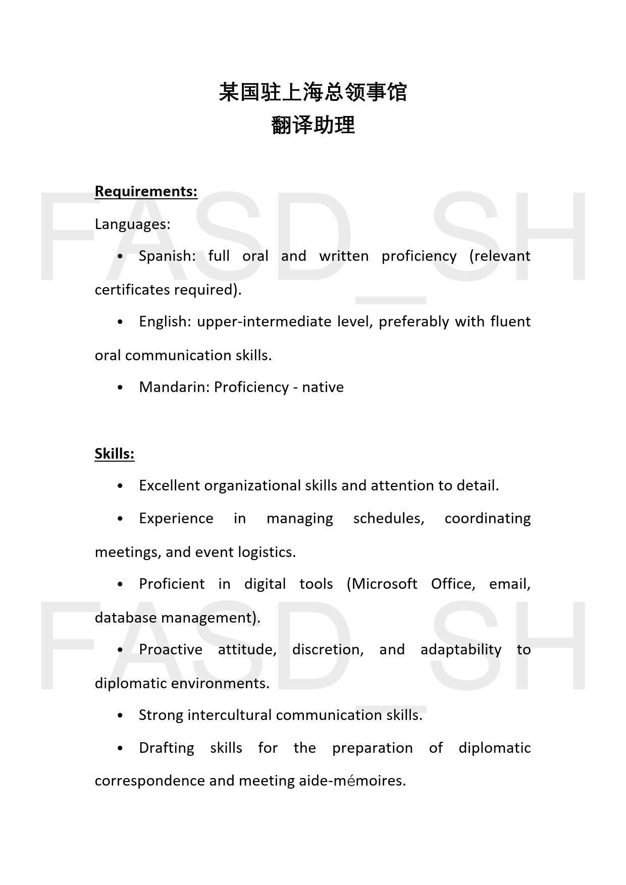 【招聘中国籍雇员】某国驻上海总领事馆 翻译助理